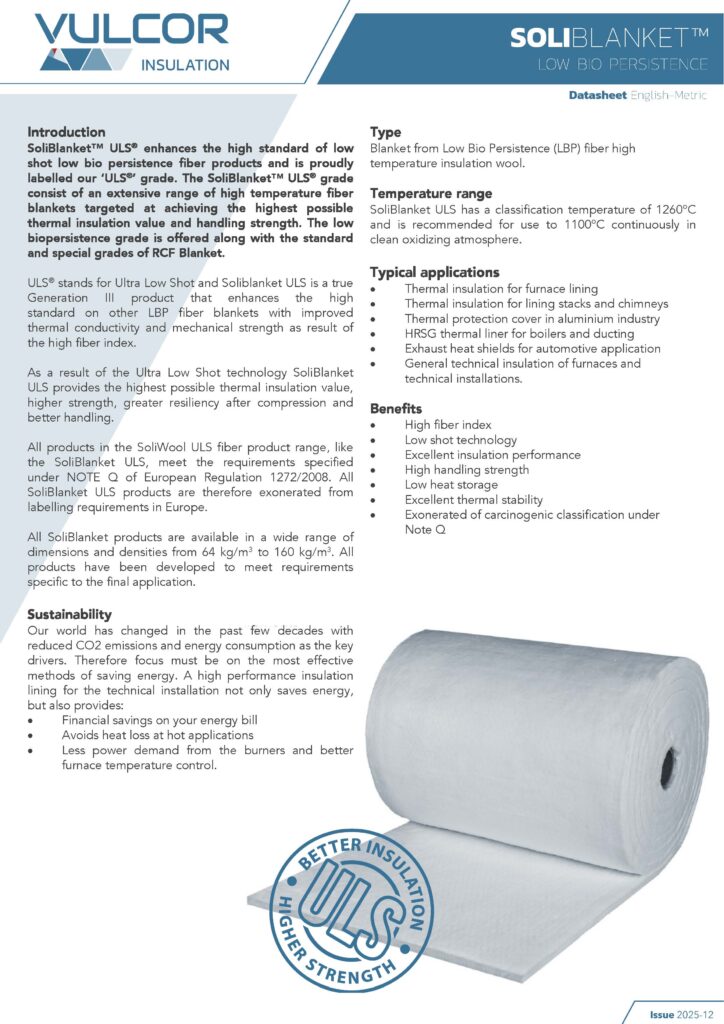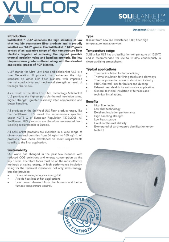 SoliBlanket ULS-grade has a classification temperature of 1260°C and advised for maximum continuous use at 1100°C.