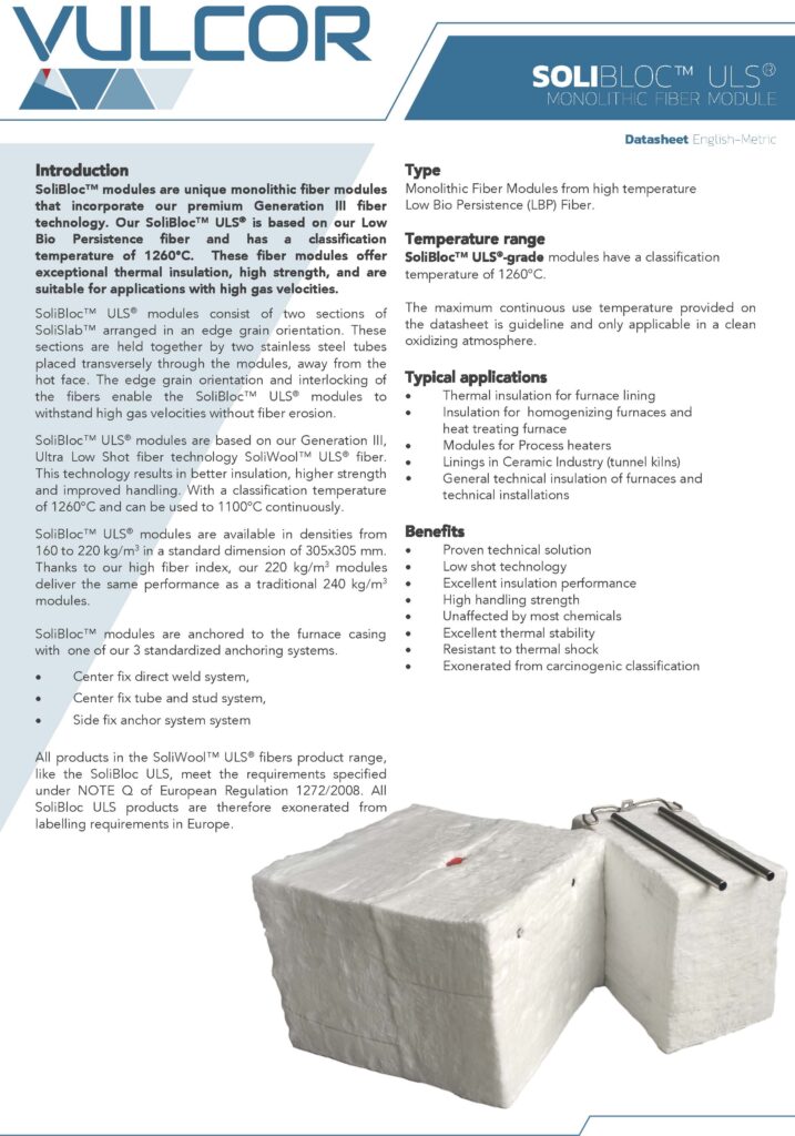 SoliBloc™ ULS-grade is part of the SoliBloc monolitic fiber module product range. With a variety of 2 Refractory Ceramic Fiber (RCF) grades, the famous ‘ULS®’ Low Bio Persistence Fiber grade and our latest addition the SoliBloc Pro with a classification temperature of 1500°C, we are offering the most extensive range temperature range of monolitic fiber modules in the market today. With our different chemical compositions we are able to provide a solution to nearly every atmosphere or temperature.