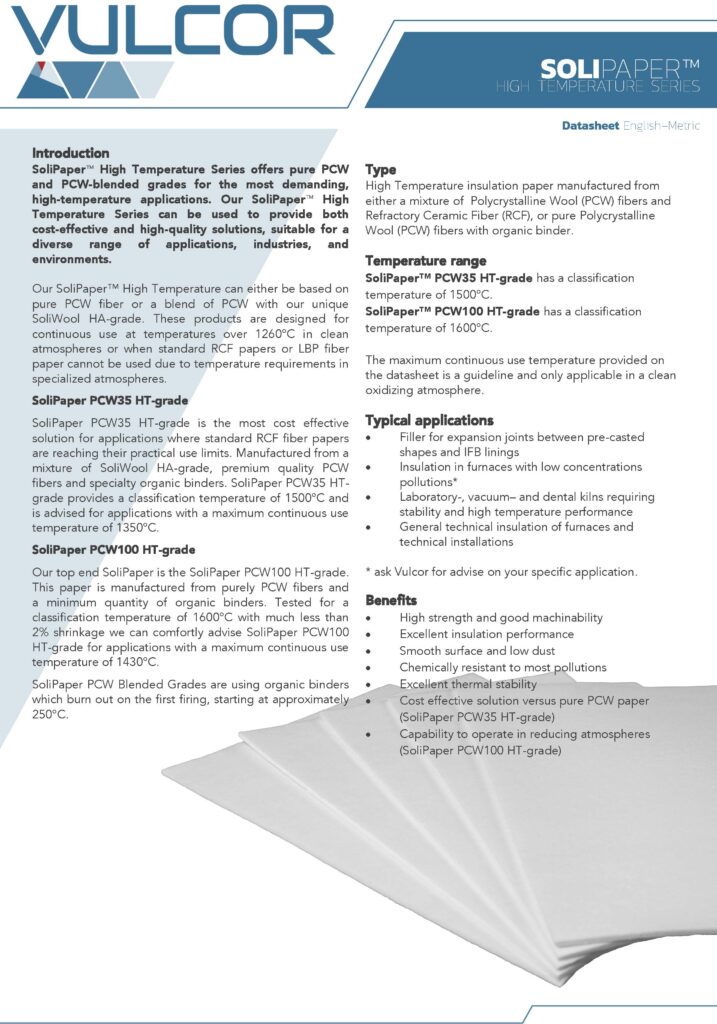 SoliPaper PCW Blended grades are our highest rated paper in the SoliPaper product range. The high classification temperature is the result of the use of Poly Crystalline Wool (PCW) fibers in the composition of the paper. By blending Polycrystalline Wool with our unique SoliWool HA-grade we make papers which arrive to classification temperatures up to 1600°C and maximum continuous use temperatures of 1430°C.