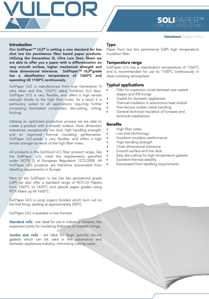 SoliPaper ULS-grade is our standard Low Bio Persistence fiber paper product and is used in a wide range of applications with great success. SoliPaper ULS-grade has a classification temperature of 1260°C and is recommended for use till 1100°C continuously.